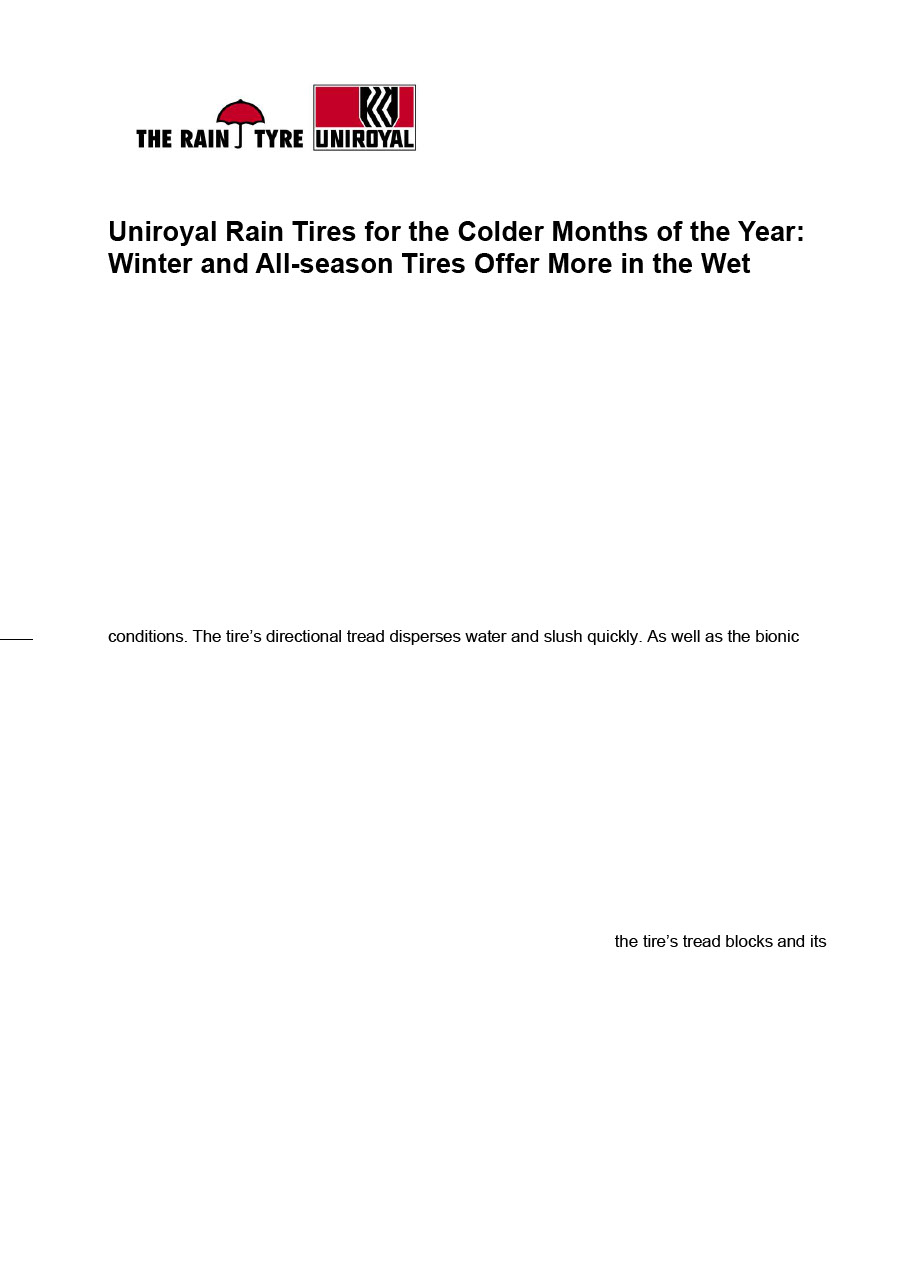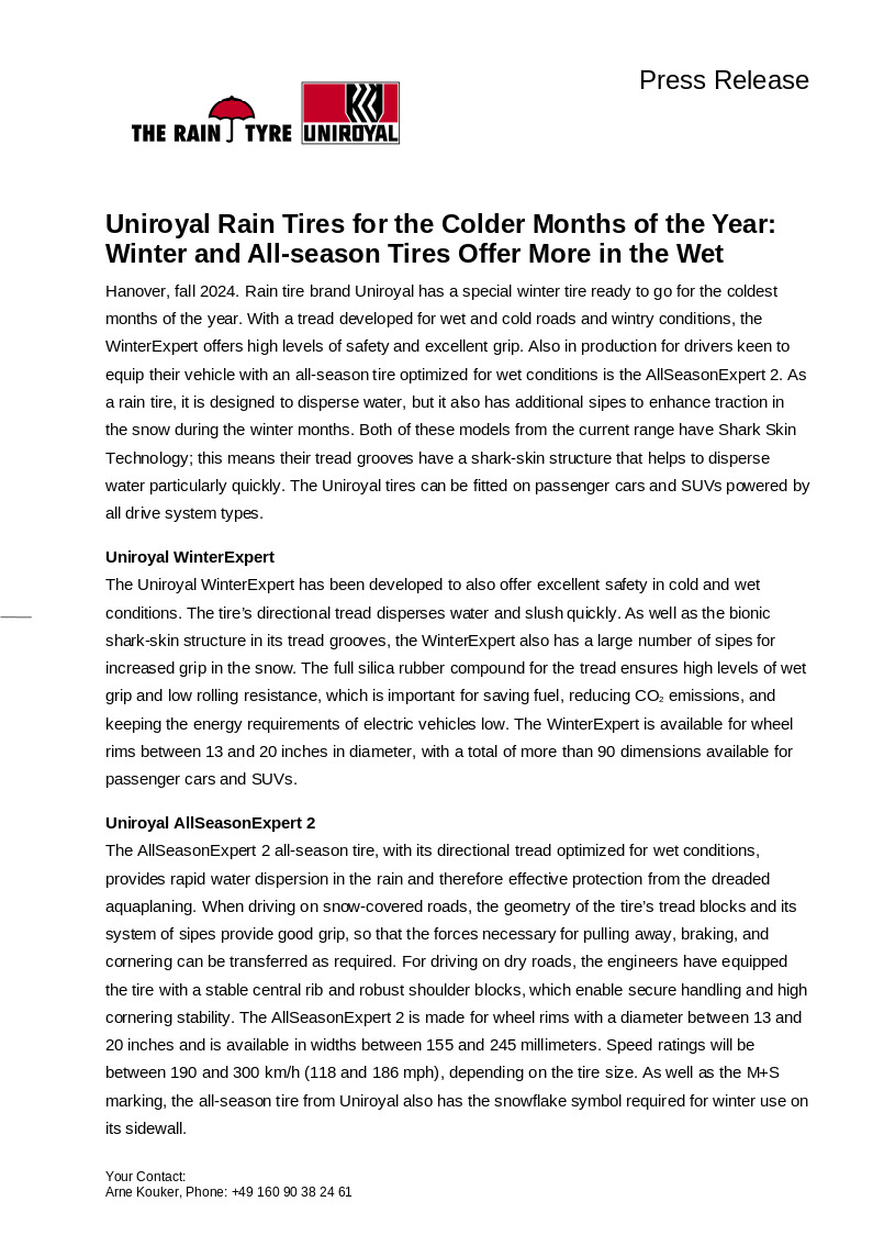 Rain tire brand Uniroyal has a special winter tire ready to go for the coldest months of the year. With a tread developed for wet and cold roads and wintry conditions, the WinterExpert offers high levels of safety and excellent grip. Also in production for drivers keen to equip their vehicle with an all-season tire optimized for wet conditions is the AllSeasonExpert 2. As a rain tire, it is designed to disperse water, but it also has additional sipes to enhance traction in the snow during the winter months. Both of these models from the current range have Shark Skin Technology; this means their tread grooves have a shark-skin structure that helps to disperse water particularly quickly. The Uniroyal tires can be fitted on passenger cars and SUVs powered by all drive system types.