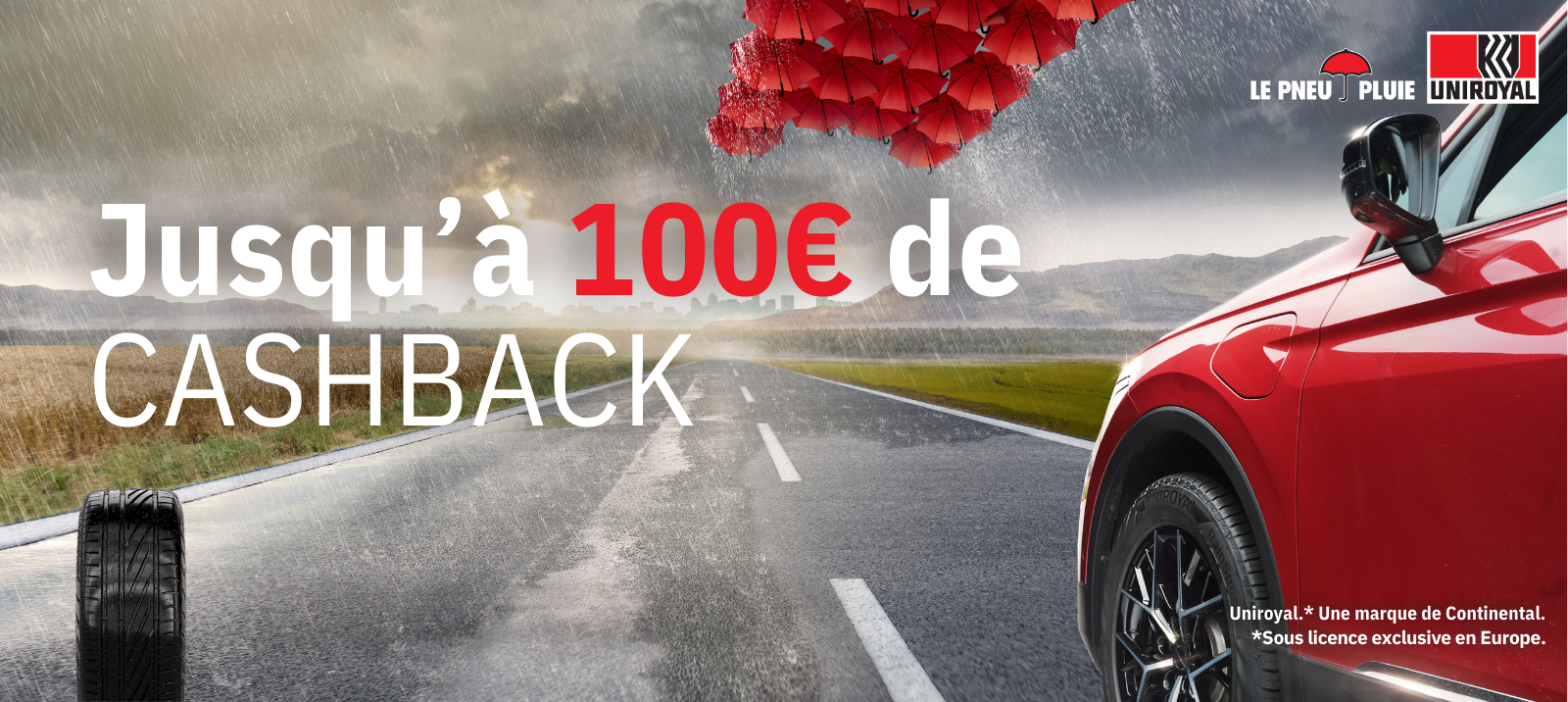 Pour l'achat de min. 2 ou max. 4 pneus Uniroyal été ou toutes saisons de minimum 18 pouces (cat. voiture) en Belgique ou au Luxembourg, vous pouvez bénéficier d'un cashback allant jusqu'à 100 €. En fonction du nombre de pneus achetés, un montant sera attribué :